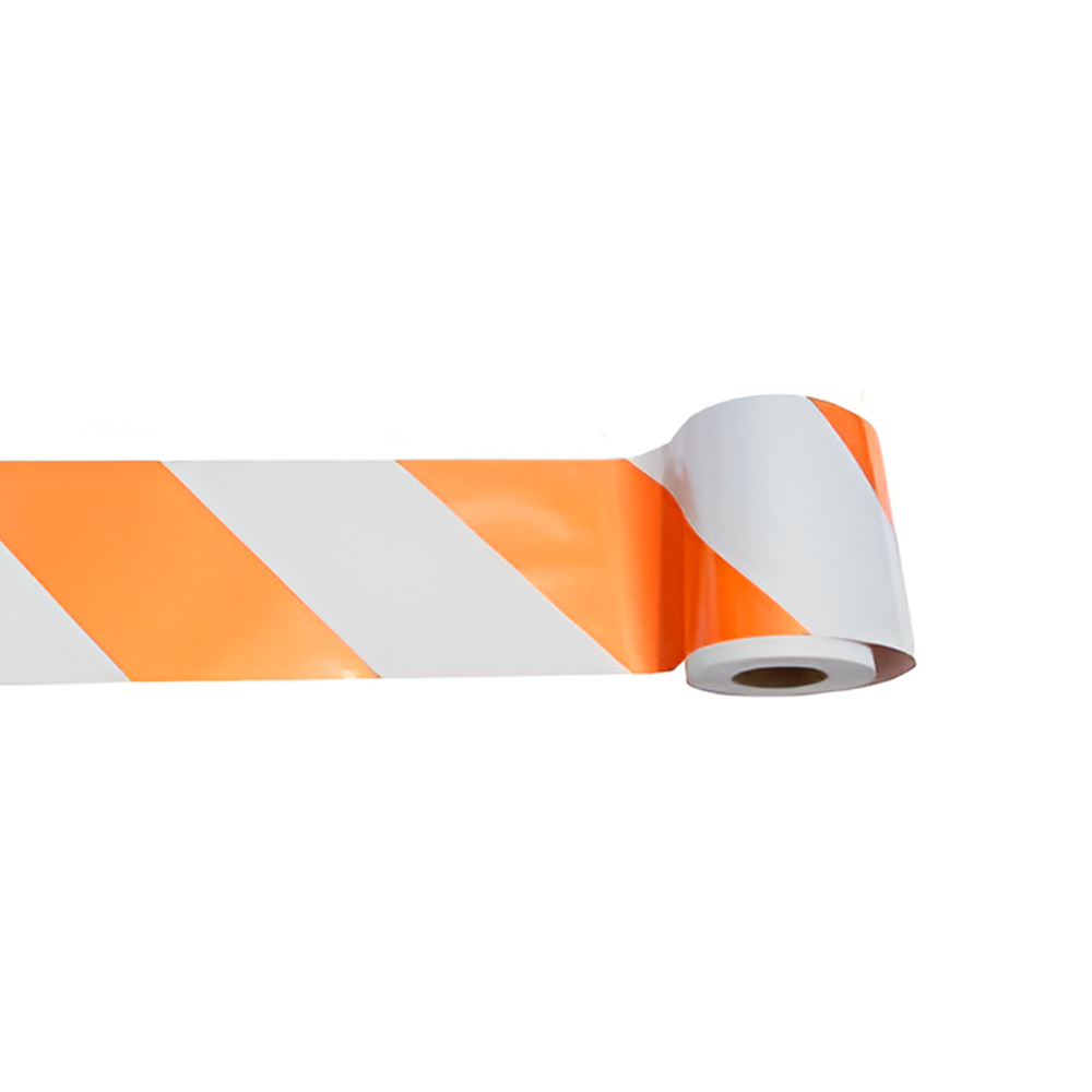 Enhance the visibility of barricades, channelizers, and other devices with reflective striped tape. Each roll of left-slant orange and white tape offers a full 150 feet of durable material offering approximately 75 candlepower – comparable to a standard speed limit sign. Approximately 7.75” wide with 6” stripes running at a 45-degree angle. Barricade tape material features high-tack, pressure-sensitive adhesive that creates a solid bond with common work zone materials. Top film on barrier tape rolls for resistance to scratching. Rated outdoor life of seven years. Find more Hi-Viz enhancements and safety supplies at 95TSS.