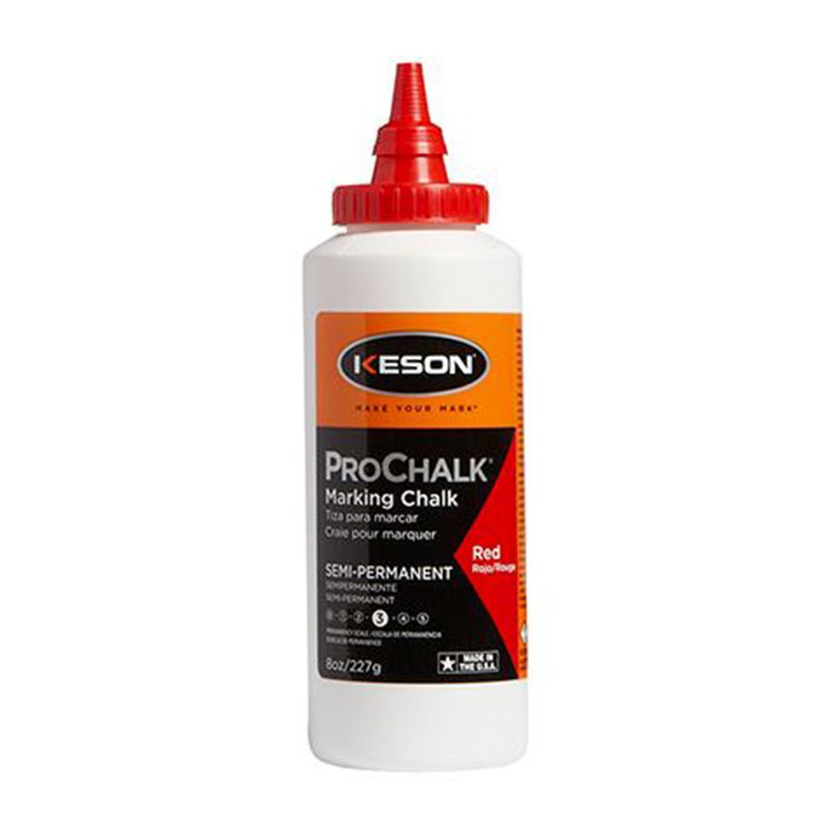 CHALK REFILL 8-OZ. RED POWDER. From the Keson brand, this marking chalk refill provides up to 5 yield line strokes and offers great flow to make bobbin filling much easier. The product is perfect for all basic chalk line needs that can be easily worn away naturally or easy to clean. In addition, this chalk produces semi-permanent lines that are, among other things, water and weather resistant.