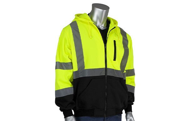 Safety vests aren’t your only option when a work zone calls for Class 3-level PPE apparel. A Class 3 safety jacket option like this hoodie provides an equally safe, comfortable alternative for staying warm after dark or when temperatures drop. Contrasting black and lime-green colors keep workers visible, while regulation-compliant reflective strips help pick up available light