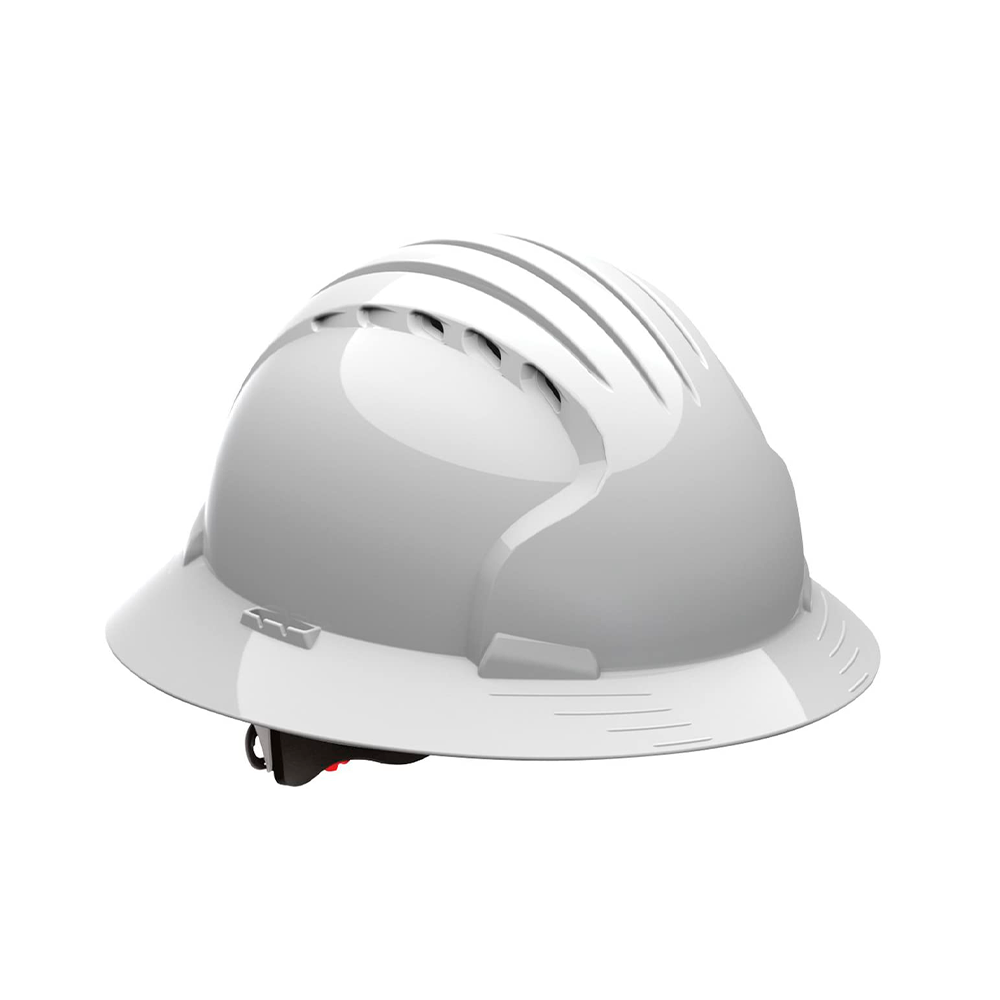 Hard hat Evolution Deluxe 6161 white full brim 6PT is a white safety work helmet with a 6-point suspension system and a sweatband.
