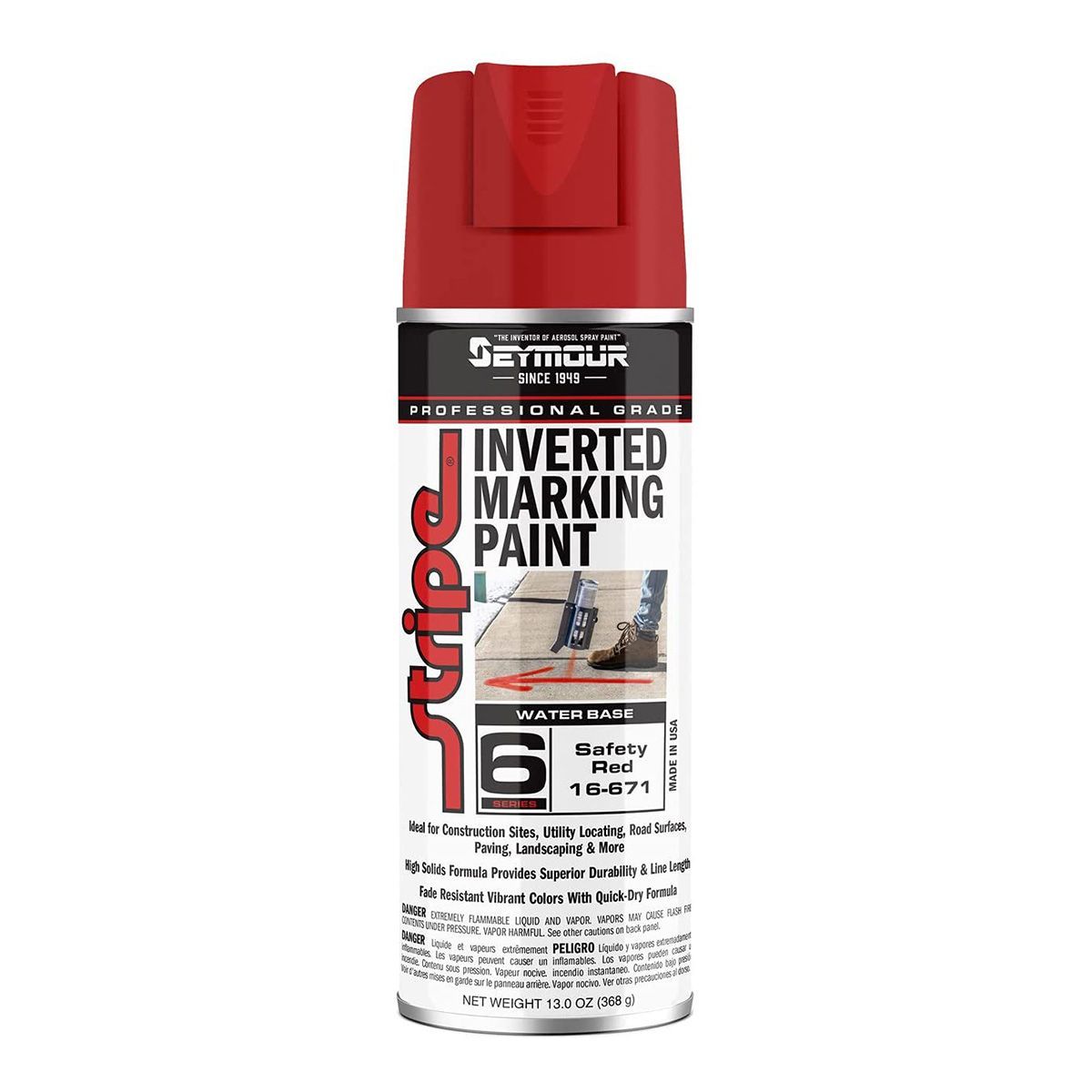 PAINT RED STRIPE 14oz. This product is a safety red water-based permanent marking ink from the Seymour brand. Ideal for banners because of its quick drying. It is applied in an inverted position to produce clear lines. It is durable, safe on grass and cannot be removed by water. In addition, its anti-clog mark is unwashed and meets APWA color standards. One of its advantages is that it dries in just one hour and can be applied manually or with a Z-605 marking gun or Z-606 marking stick.