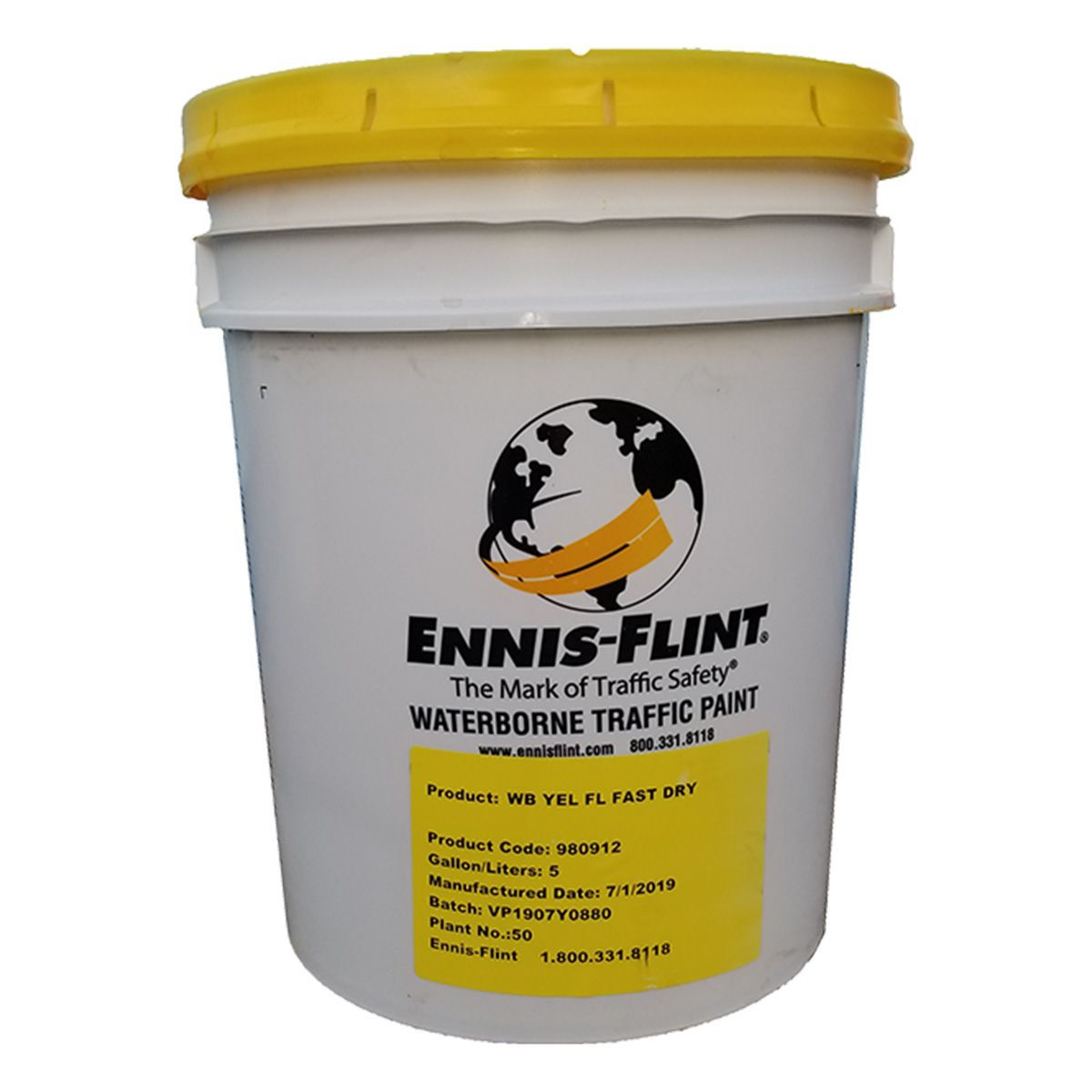 PAINT TRAFFIC YELLOW 5GL WATER BASED. Ennis-Flint water-based yellow paint helps make high-traffic and road areas very easy to read. It is an easy-to-use, fast-drying, water-based formula designed for both normal and airless air atomized blasting equipment. This product is a water-reducible solution with a quick drying capability of 30 minutes or less. It leaves no smudges or tracks, making it the perfect choice for all crosswalks, roads and high traffic areas. When used with proper adhesion and bead gradation coating, it provides excellent retroreflectiveness. It is also made for any type of terrain and specifications and its yellow color is visible at night or day to allow drivers to see them from a distance.