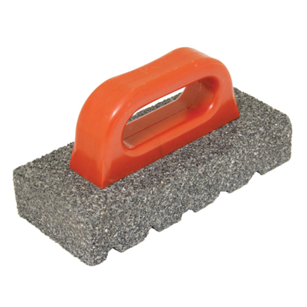 STONE RUBBING W/HANDLE 8X3-1/2. Made from silicon carbide, this friction brick makes cleaning concrete quick and easy. The product is attached to a contoured plastic handle which minimizes fatigue. Its main function is to create a smooth professional finish on block walls, wet tiles and concrete, as well as being used for decorating and preparing concrete.